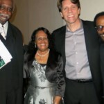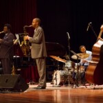 Wayne Shorter receives the Thelonious Monk Institute of Jazz Lifetime Achievement Award from Herbie Hancock surrounded by Wayne's band members Brian Blade, John Patitucci, Danilo Perez, trumpeter Roy Hargrove and members of the band Take 6. (PRNewsFoto/Thelonious Monk Institute of Jazz)